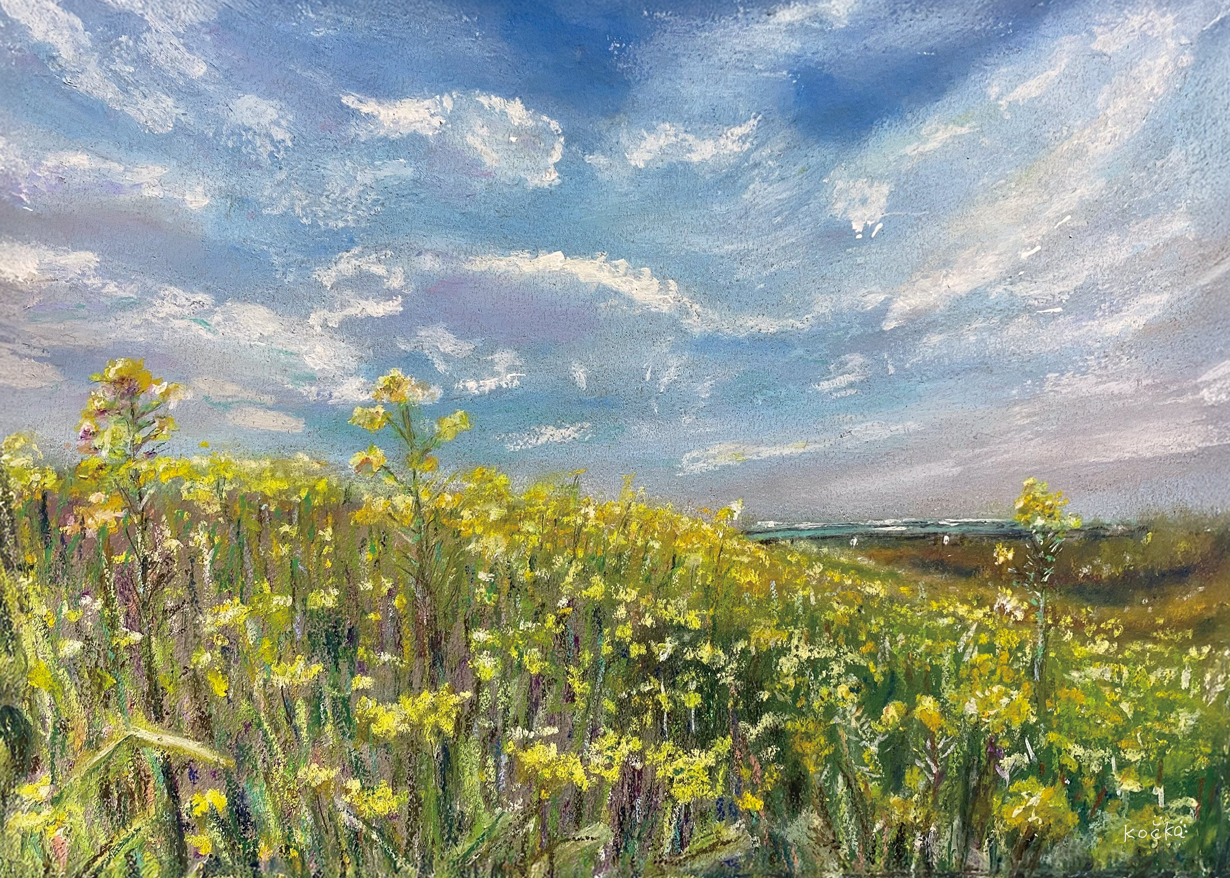 Based in Japan, kočka—known as “the painter of skies,”—creates gentle, light-filled landscapes using oil pastels. Inspiration is drawn from skies, plains, wetlands, and urban scenery.
